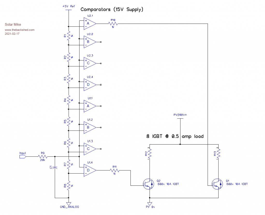 Use something like this, 8 comparators each connected to an IGBT\Load, connected in place of the IGBT in the original circuit. Mike |