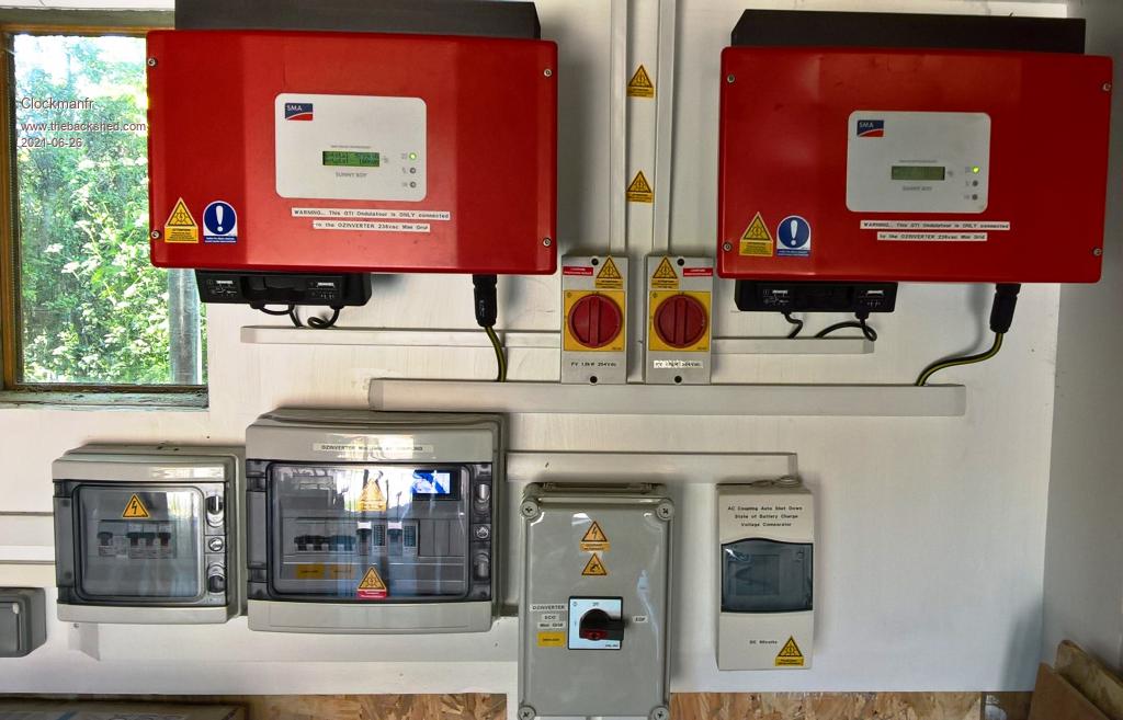 Photo shows the most recent 10PV panel AC coupled 3.7kW with old torroid GTI's installation.   I stick to the French regs.