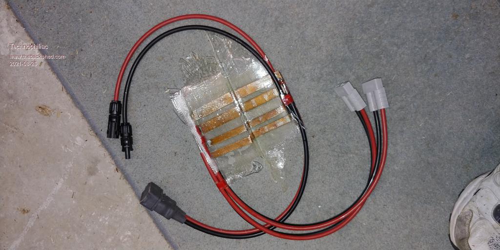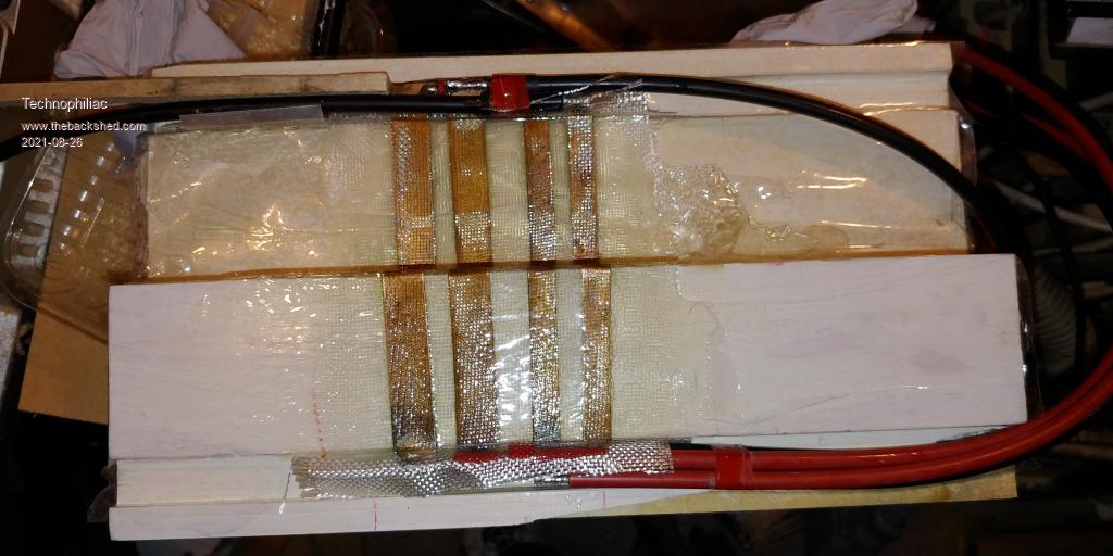 Thinking about this concept I could also use it to bring 240V AC into the house from a generator(s) (or other inverters). Not found much on the insulation value of fibre glass (Glass cloth and epoxy resin) other than it is supposed to be very good. It might be I need to test an example once made. The plan was to make the conductor as thin as possible, using one layer of 100g or probably 200gm cloth each side of the copper. I expect it will be fine for 60 volts. 240V AC? 500V DC? Current status is moulds are being made to compress the glass as it sets. I intend the finished product to be waterproof - fully sealed inside fibre glass from cable insulator to cable insulator. Any thoughts how I can assure myself the thickness of glass achieved is sufficient insulation for mains voltages or solar panel DC voltages?
