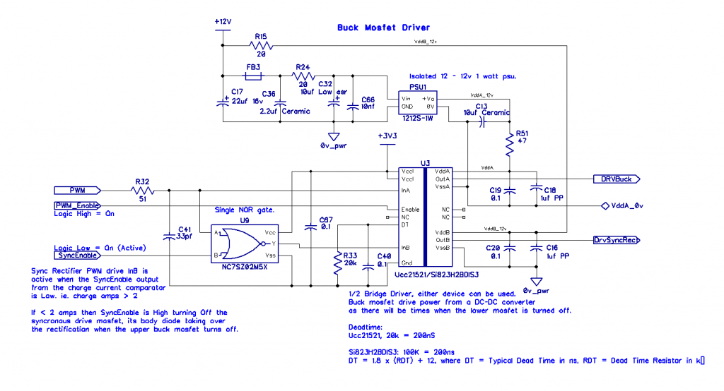 Have used a dual pwm input driver, either a UCC21521 or an Si823H2BD-IS3 can be used here, both have identical pin outs. The Buck 12v power is from an isolated 1212-1W PSU, as a bootstrap config wont work here if the synchronous rectifier mosfet is turned off.