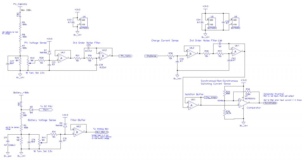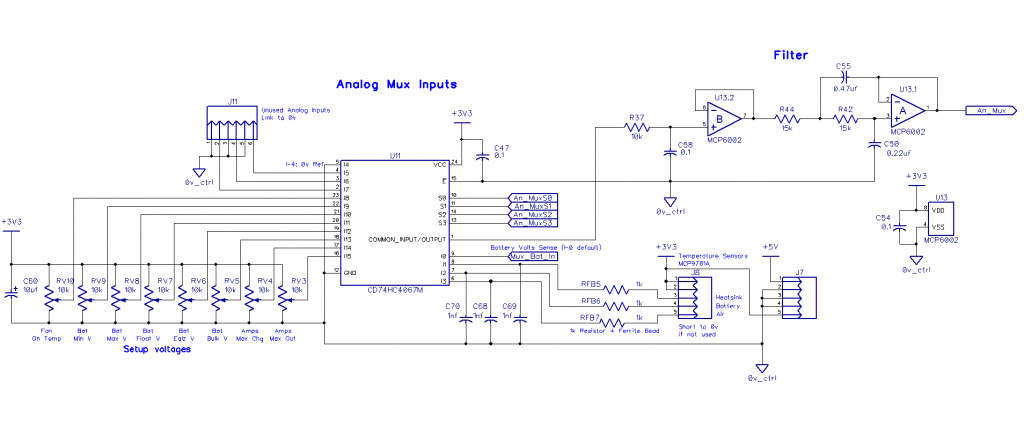 PV voltage and charge current go direct to the CPU ADC inputs, Battery voltage is connected to the analog mux input 0. I prefer to use analog filtering on these inputs as the noise levels with all the close proximity high current switching could be very high.