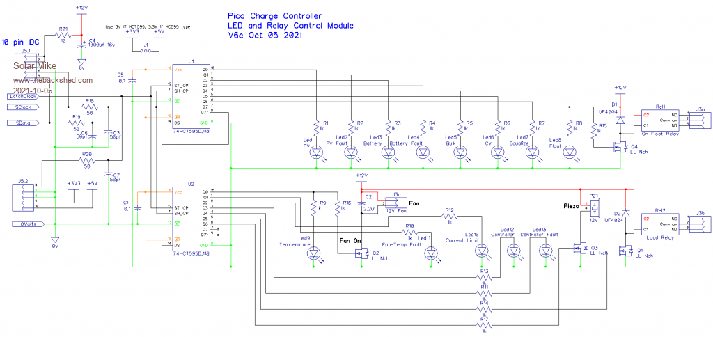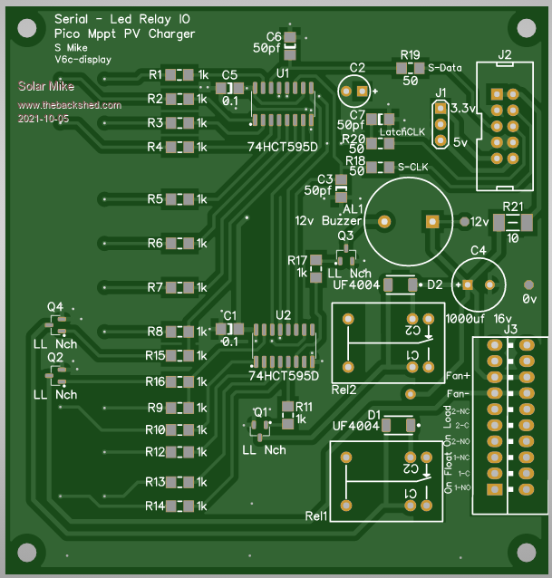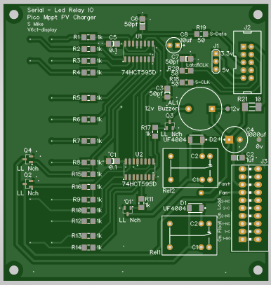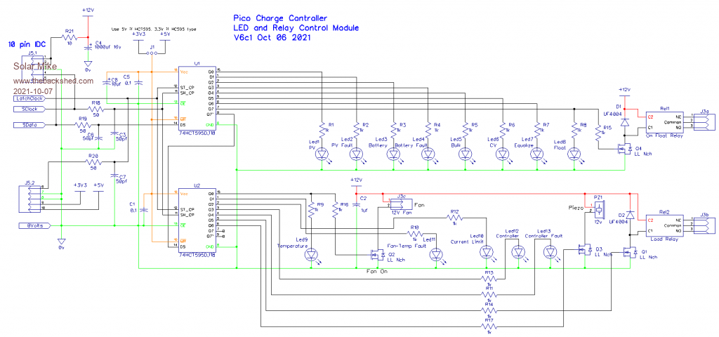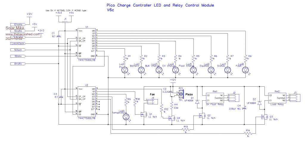 Serial latched LED and Relay module; will design a small pcb as per the schematic, that allows the leds to show through the front panel to display charge status.