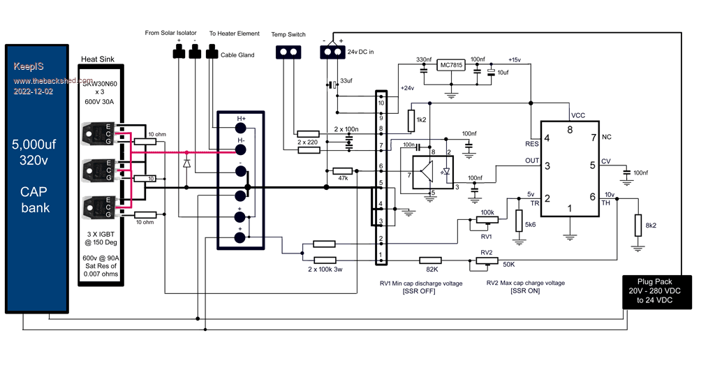 If solar output availability is low and the solar input voltage drops under the load of the heater element to less that 30v to 50v volts, the small DC to DC converter supplying 12v (15v in my case) will start to drop, the SSR will (should) switch off before the voltage gets to zero (the 555 may still be running) and in doing so, allow the solar voltage to rise again to the HI voltage trip point, the SSR will turn on, and the same loop will repeat with the NEON flashing at a very slow pulse rate.