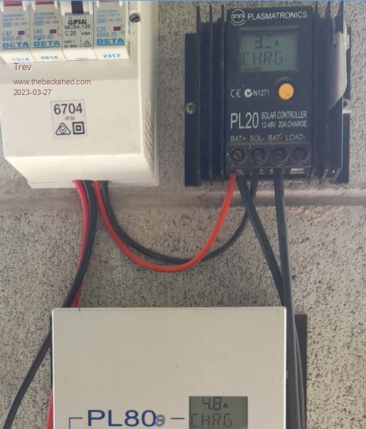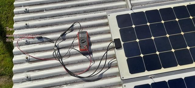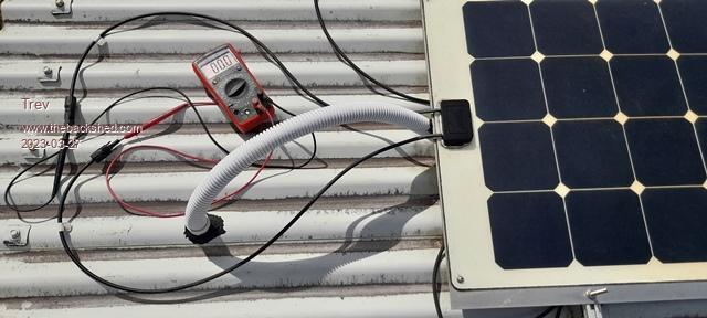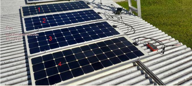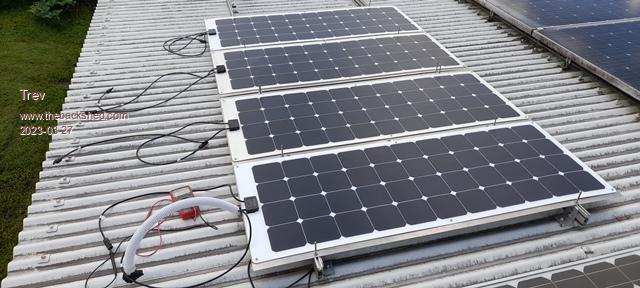 There are 4 panels in series to make 48v nominal for charging the quad bike battery, nominal 48v. First installed 9 April 2021.