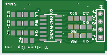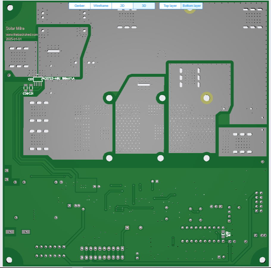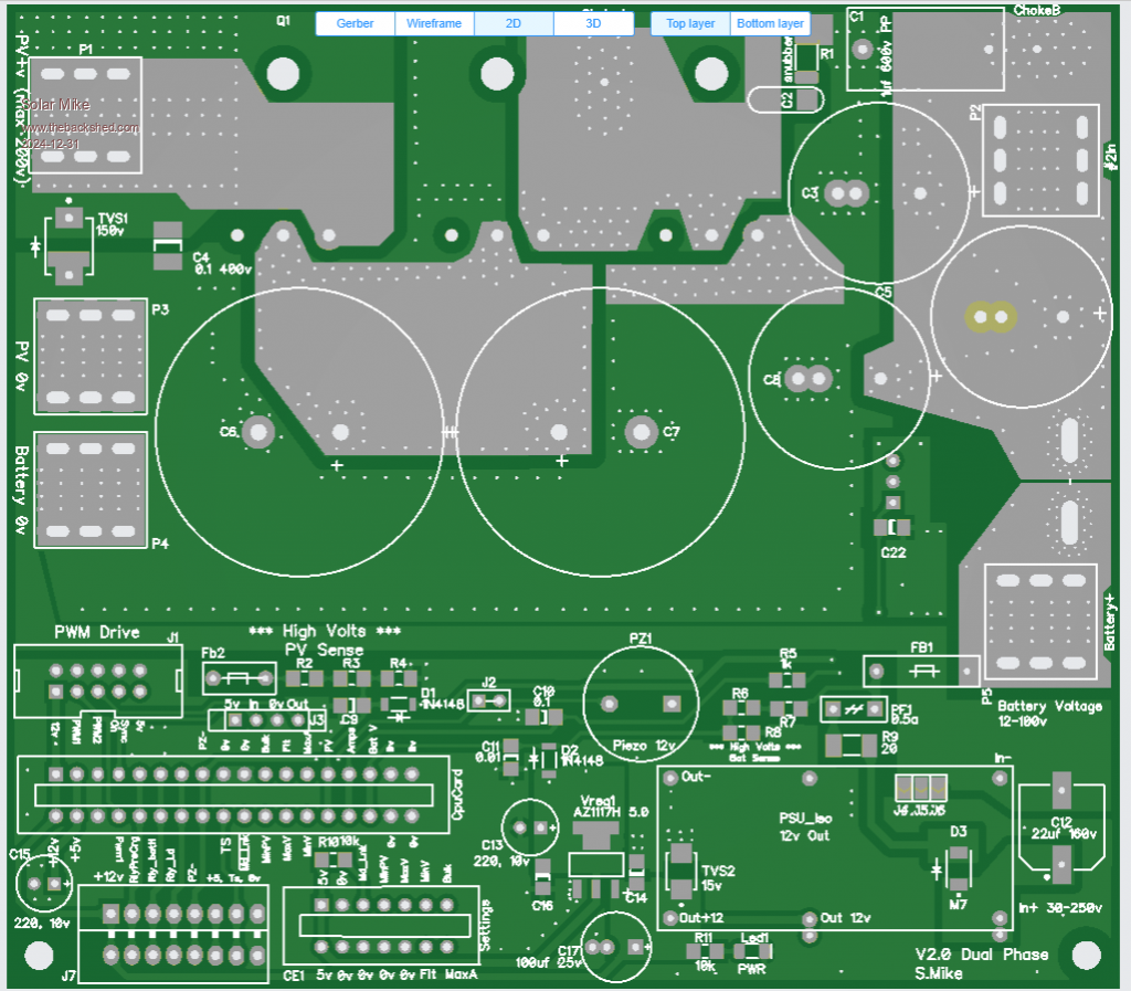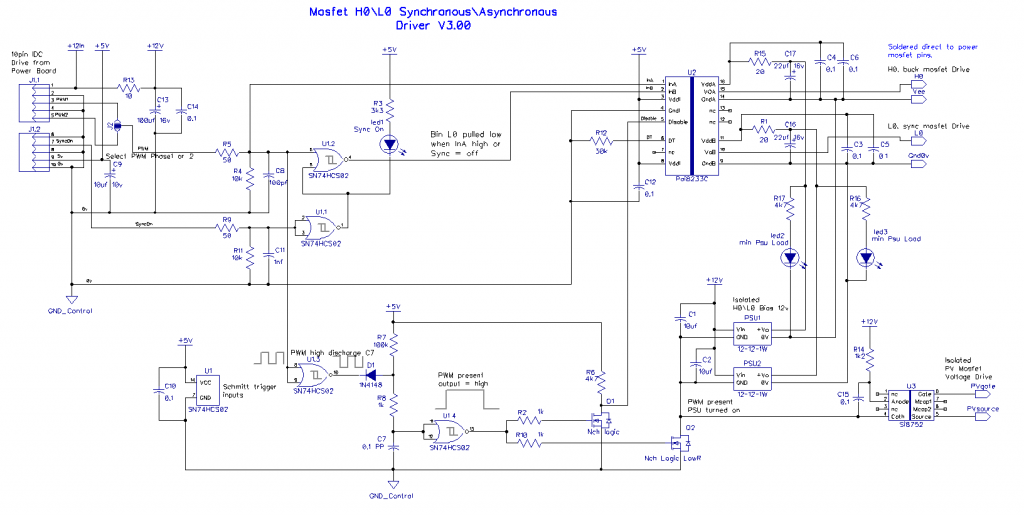 The IDC input cable input has 2 PWM drive phases present, a solder blob jumper selects one to use, the IDC can extend to another power board\drive card, without any cpu or other components; this will drive the buck circuit 180 degrees from the first, using a common PV input to both power boards.