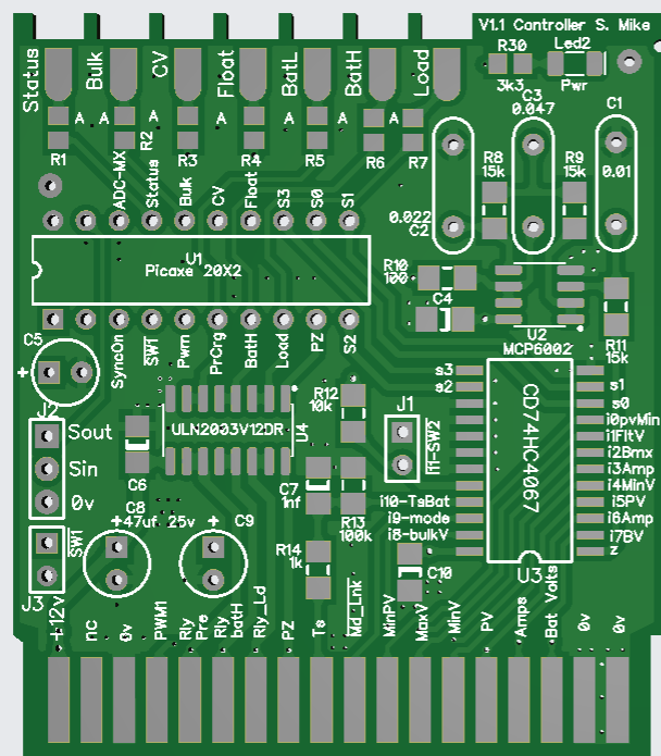 CPU is a Picaxe 20X2 on a small 4 layer pcb that plugs into an edge card socket, the other edge card socket has the setting up pots on a small pcb, when unplugged their values are stored in the cpu's eeprom memory.