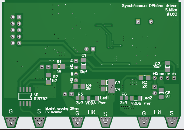 I have been playing around with a smaller design in the last month or so, using synchronous buck conversion and dual phase output. The first version used bootstrap circuitry to power the H0 buck stage, great fun getting that working ok, there is a very fine line for the synchronous mosfet rectifier at low duty cycles to start acting as a reverse boost converter, software has to continuously test to see what the charge current is, as it can no -ve and blow things up; finally managed to destroy 3 mosfets and a couple of driver chips in getting it to work reliably.