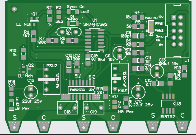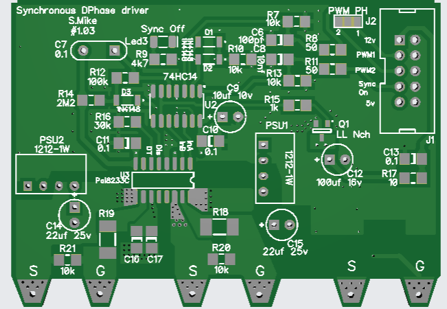 I have altered the driver card somewhat, in removing the gate drive resistors as these are now on the main power board, and simplified the circuit by using a quad nor gate with schmitt trigger inputs. Both the Pai8233C mosfet driver and the Nor gate SN74HCS02 are very cheap at LCSC.
