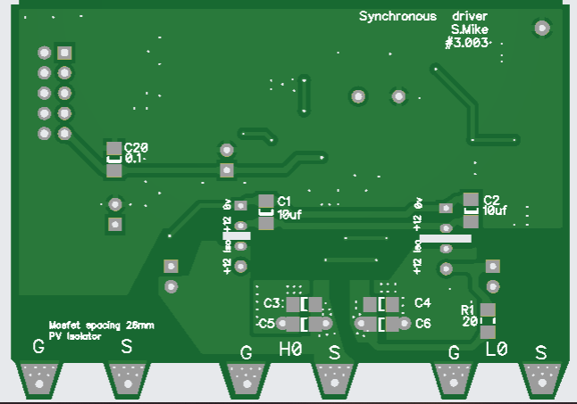 Slight redesign of the driver board using 1 watt isolated 12-12v PSU's for the H0,L0 bias supplies, making things much more reliable, as now the synchronous rectifier mosfet stage can be turned off at low charge currents automatically using a comparator, this puts it into asynchronous mode using its internal drain-source diode, thus preventing boost mode operation from destroying things.