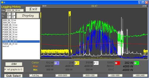 Hi Richard, seems like there are no problems with the array. Can only blame cloudy weather. The web cam seems a little tedious, and $800 for Fronius logger, is over the top. You could consider the CurrentCost meter, sold through Jaycar, for around $200, +$20 for additional clamp meters, up to 3 total. My VBapp program takes the data from the meter and produces daily logs. here is a sample log from yesterday. There are 5 graphs, solar RE produced[what the Foronius logger might give], Household power consumption, OFF PEAK heating, outside temperature, and calc NET household import/export. You can easily see fridge/TV/computer/etc loadings and the effects of clouds on the solar RE. These units don't require mods to any household wiring, as they use clamp type sensors. The software available from Current Cost website does not offer the recordings that I have, but only totals and history logging. The live feed option is difficult to use for other purposes. I am still working on my VBapp but I may make something available if there is enough interest. Gordon. become more energy aware |