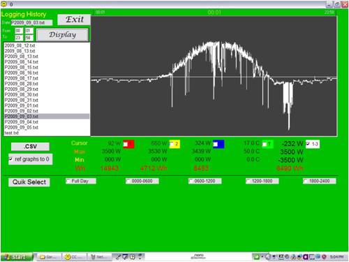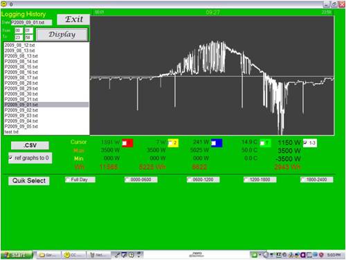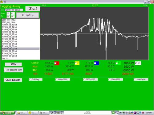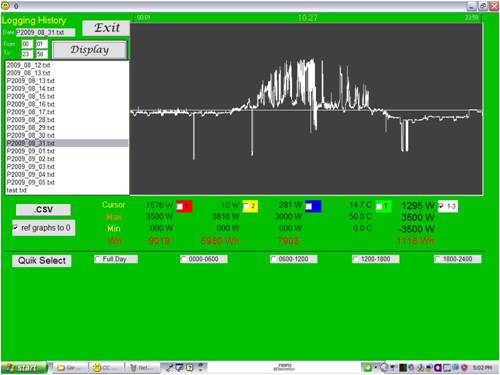 The Base load of the house is approx 190W, and this is attributed to the 4 laptops that are logging data presently. In will be investigating an Intel Atom PC, for all logging soon. My intention is to allow real time viewing of all my data through the internet. Must talk to Gizmo!!