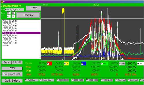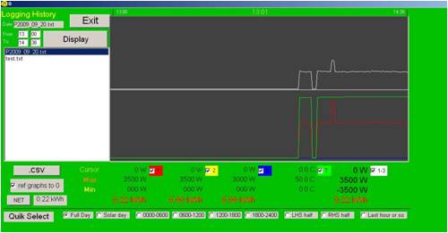 I have a particular coding style. I record RE on channel 1, and house loading on channel 3. If you had the same sensing, then my program would give instant W RE production and house consumption, and net import/export W, updated with the latest data from the sensors. The historical data, collected and stored at 5s,10s,20s, whatever timing interval can be displayed on a graph. This is similar to the way Gizmo displayed on his piclog. I have added many features to allow rapid examination of daily data, current and historical, with mouse click selection. I have provided daily kWhr meters. that also work over any portion of the day. I also have a .CSV button, so the data can be exported for further analysis with spreadsheet/database etc. I also have quik select buttons, so portions of the day, and the last trends can be easily viewed with a click.