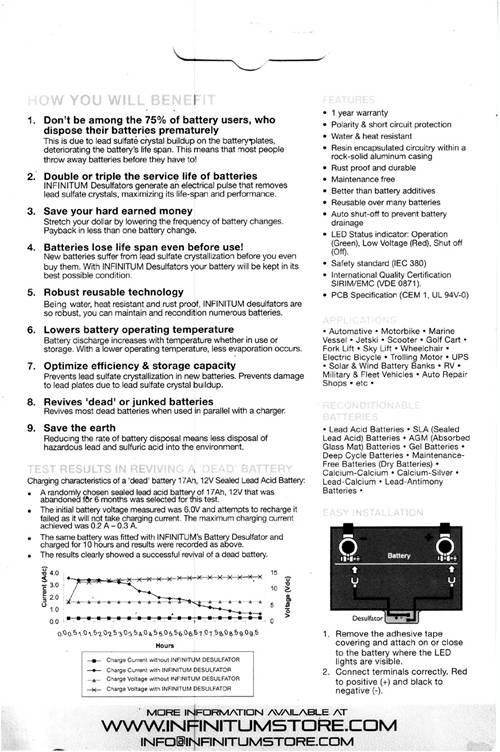 Hi Bob, I ordered a desulphator (like the one you show above) from the Infinitum store and it arrived today. I ordered the 24V model but there are no marks on it or the package to say what model I got. To be safe I connected it to a 12V battery and the green light comes on - indicating its working - CRO shows its working too. If it were the 24V model the red light should stay on according to their tech info. Did I get short changed? There is a price difference. I was just wondering if you figured out another way to check its voltage rating without destroying it. I could use it on 12V as the battery bank uses serial/ parallel 12V/100Ah batteries. I did send them an e-mail but am reluctant to spend extra postage money in case they want it returned for exchange. Did you get the 24V model? Does that have any distinguishing marks? They appear identical on the pics on their website. Klaus Klaus |