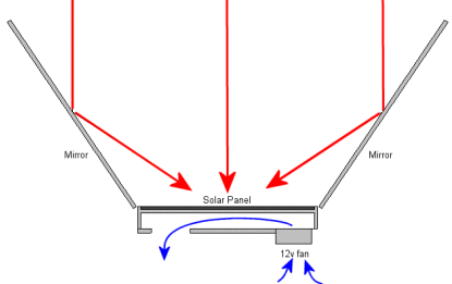 But the heat will also increase, and this is what is so bad for the solar cells. So I though a couple of 12v PC fans to cycle the air behind the panel. Or even an additional fan facing the front of the panel to blow air over the surface. The fans may drain 5 watts, but on a 80 watt panel the mirrors have given us an extra 40 watts, so we still have a net gain of 35 watts. At $10 a watt thats a big saving.