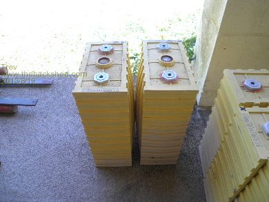 The new pack is 900Ah 48v Thundersky Winston LYP. 3 parallel of 300Ah cells x 16 cells in series. The battery box is just big enough to house all 48 cells. Used 3 rows of 10mm thread on each side and the ply box end with steel angle as strapping. The cells must be strapped to stop them cells swelling in normal use. The second end of the box has no screws so can be moved as a clamp plate on the cells. Once the cells were clamp up, 1 screw was put in the top corners of the box sides to hold the box together. ![]() ![]() Cells all connected up as normal and charge from solar until the first cells reach 3.6-3.7v. Then all series connections are removed. All cells are connected in parallel and charged with 11 x 3.7v chargers until all cells are the same voltage. ![]() ![]() ![]() Then the parallel connections are removed and reconnected as normal (3P16S). It is great to see the battery power still going out to the grid after midnight. This morning checked at 2.30am and power was still going out to the grid. And still plenty of stored power to cook breakfast. In fact I could go to the shed and use the welder or metal lathe, milling machine or compressor before sun up if I wanted (the old batteries run all these things). Plenty of power. We have also seen the batteries full up again by lunch time every day so far. One day was even cloudy but still full by 1pm. Trev @ drivebynature.com |