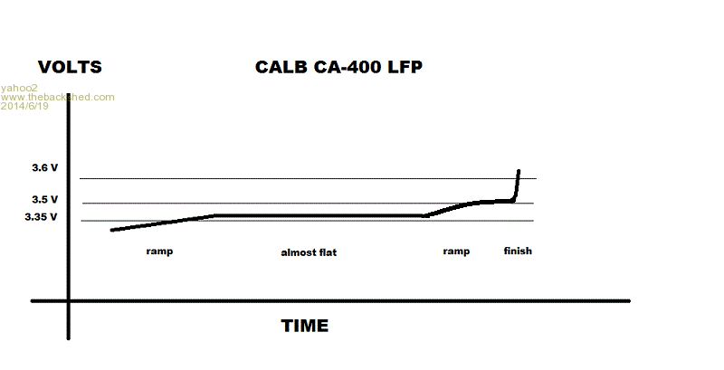 One of the things the more observant of you may have already noticed (if you dusted of a calculator) is the higher voltage we are dealing with here. I will convert the volts to 4 cells so I can compare it to 6 cells 12 volt of wet lead acid (WLA). (cell volts in brackets) nominal volts for LFP (3.2V) 12.8 volt state of charge delivered was 30% @ 3.29 volts/cell for the LFP's 30% SOC CALB LFP(3.29) 13.16 volts WLA____(1.96) 11.75 volts One thing I noticed while charging is the curve has two distinct ramps and two sections that are almost flat. At one point one of my multimeters was not capable of measuring the cell voltage rise, the other one was ticking over at one ten thousandths of a volt every two and a half minutes, that is almost billiard table flat. The voltage rise is very rapid at the finish, even with the tiny chargers hooked up it was going up at one mV every 2 seconds. This looks to be a distinctive characteristic of charging the CALB cells at less than 25% of their capacity.