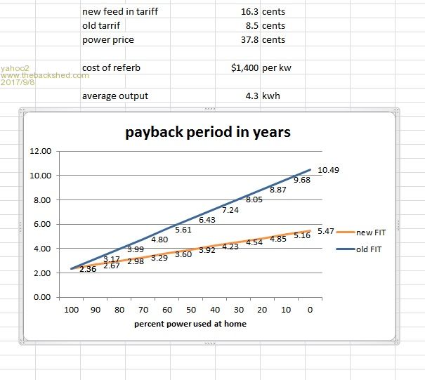 I was having a poke around at the new Energy made easy website and noticed that one major retailer had followed the lead of Enova and lifted their feed in tariff base rate to 16.3 cents. Had a phone call this morning from someone asking if they should think about fitting more panels so I have made some assumptions and plucked some very rough numbers out of the air. We have to factor in what happens with renewable energy credits for upgrades and compliance with Australian standards changes since the original system was installed etc etc. ![]() I would say if there is electricity that can be time shifted to the 10am to 4 pm zone that is normally imported then a reasonable amount of that sweet moola can remain in our hot little hand. I wouldn't over-panel only to chase the $250/year/kw installed FIT if my power needs were already catered for, it equates to a maximum of 2.1 cents per Kwh reduction in the power bill. PS the average output is low for my area because of the orientation of the remaining roof space available and some difficulty in matching panels. I'm confused, no wait... maybe I'm not... |