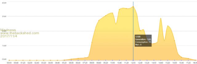 Congratulations George, that has to be the longest post I have seen on a forum .If you look at the PDF on the first post in this thread and the NOCT of those panels you will see the expected output is 185W for a 250W panel. I know someone who set up micro sprinklers to cool panels which did gain an increase in output but the power to run the pump canceled most of the gains. I am with you just add more panels, as for angles the ideal angle for grid tie is supposed to be 10 degrees less than your latitude. Where I am here in QLD it is 26.5 so the optimum fixed angle is 16.5, this is supposed give the best total annual output. But as I am off grid maximum annual output means diddly squat. I need to aim for the most output on the worst days which is when there are thick dark clouds. What myself and others here have discovered is that for this situation is to have the panels laying flat. This gives the most power when there is full cloud cover diffusing the sunlight. Flat panels see more of the sky and therefore produce maximum possible output. As for your comment about running 10KW of panels on a 2KW inverter, have you actually done this? I have been told most inverters will cope with 10 - 15% oversized array but 500% is probably pushing it way too far. Here is my result from yesterday which only had a couple small clouds, the array is 5KW laying flat, it peaked at 3.85KW. After that, the output was reduced due to a regulation system I am using to control battery charge. ![]() There are only 10 types of people in the world: those who understand binary, and those who don't. |