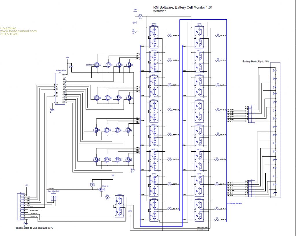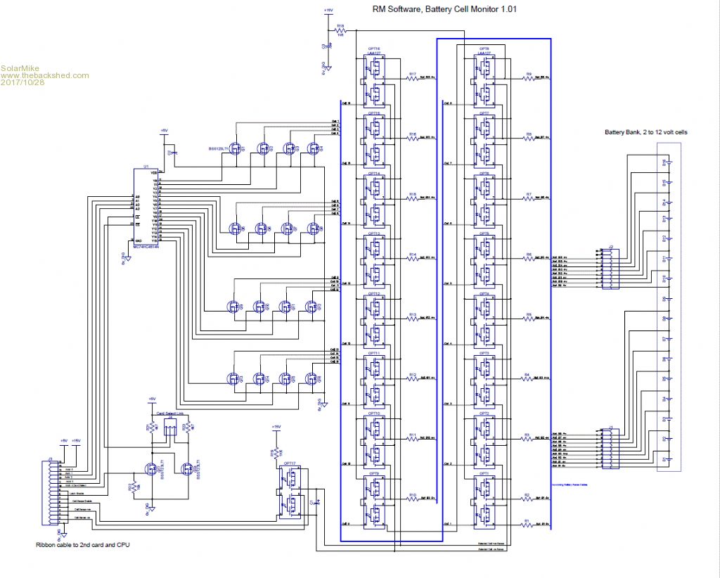 Have decided to make up a quick trial test interface pcb that can link to a generic embedded cpu, that allows monitoring of the individual series cells in the bank. Have decided to use those OptiMos high voltage solid state switch chips, and using a simple multiplex arrangement(74HC4514) to switch in pairs of LAA127 switches across the battery monitoring wires. Each pair will briefly charge a low leakage capacitor then turn off leaving the cap isolated and floating, a second switch pair then turns on, connecting the cap to a high impedance buffer amp to CPU A/D inputs via a voltage divider to limit the A/D max cell voltage exposure.
