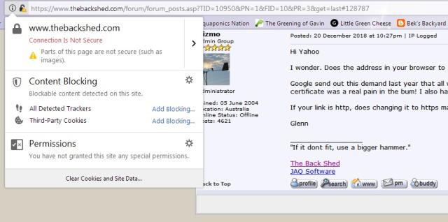Yeah this https is a real pain in the butt. If a image in a post isnt from a https source, the whole page is considered not secure. I'll need to go over it again looking for any http only links in the forum code. If a members links to a external non-secure image or file, that also makes the whole page insecure, but that cant be helped. The old Google links to the http version is also a pain in the butt! I need to add code to detect if the page loaded was http or https, and if http, redirect to https. Nice little job over the Christmas break. Its this attitude by the likes of Google, Facebook, etc, that kills sites like this. And now the browsers label a normal http site as "Not Secure", which makes people think they are at risk by using the site. Its all BS, its not a bank or finance web site, it doesn't ask for credit card information, its just a friggen hobby site! Add to that the 200 packets a minute hitting the server from China based hackers and spammers! Glenn The best time to plant a tree was twenty years ago, the second best time is right now. JAQ |