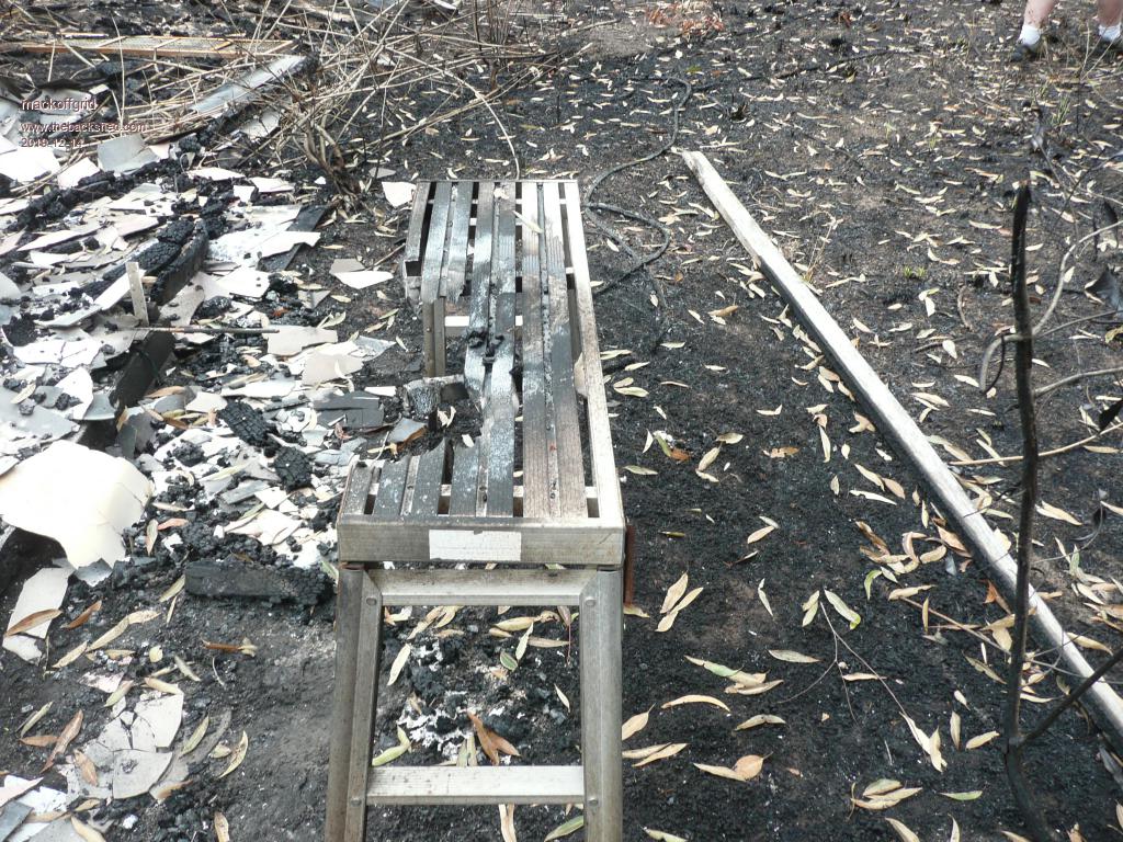We had two structures at the cabin site, the cabin and 6 metres away was the Plant room (Solar controller, inverter, batteries / laundry with obligatory chest freezer and misc storage)  aka Laundry.  Both built in the very local hardwood.  The ground mount 10kW solar array, 3 high x 13 + 1, was one metre in front of the laundry.  Both buildings were totally consumed.
