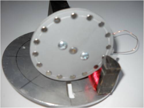 This shot shows all the little 1/4' x 1/4" neo magnets press-fit into the HDPE wheel. Every other one is a "N", so the flux changes back and forth as each one passes through the cut in the pick-up coil core.