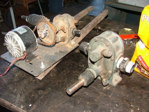 How about a gear pump? I have a couple, one small and another a bit larger. The smaller one was rigged up to a 24v scoota motor and I used it to fill the header tank at my last place. The bigger one will go onto a little 1hp Vikers petrol motor I have.