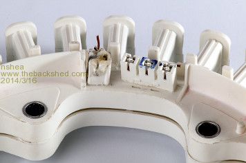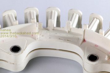This PET (polybutylene terephthalate) or glass filled polypropylene (I'm not sure which) is exceedingly tough, and it took some shaving with a Stanley knife to get a smooth surface. The reason for removing the terminal blocks is to make room for the stator plate.