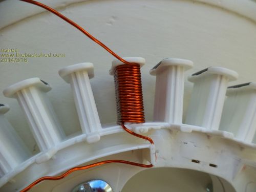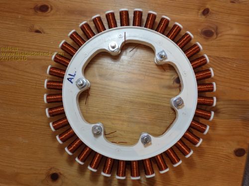 The stator was wound one phase at a time, with six pole pairs making up each phase. Each pole has forty one turns of wire, and each coil pair takes about an hour to complete.