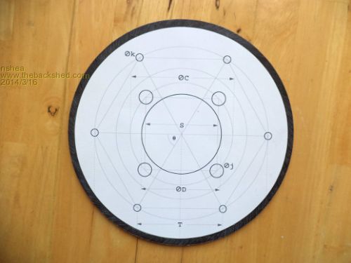The CAD drawing was printed at 100% and high resolution, then stuck on the plate. A very sharp screw was used as a punch to mark the hole centers. The paper was removed and white acrylic smudged in the holes. Originally, I tried scribing the design on the reverse using ruler and compass but one of the centers was 1mm out. The printout method proved 100% accurate.