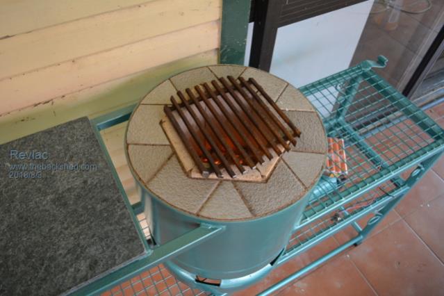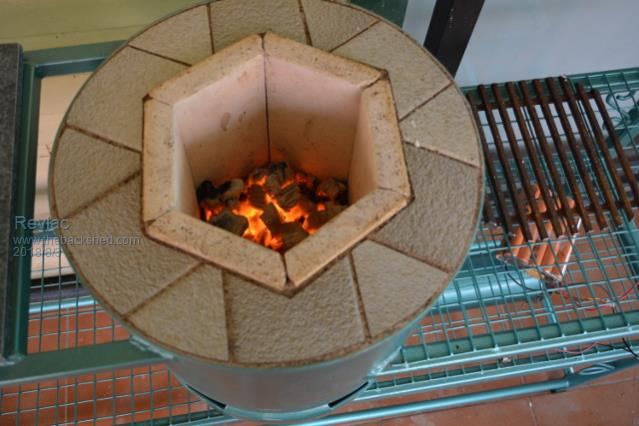 Made up a grill inside to hold the charcoal and surrounding that is a round steel plate/disc to support it and the firebrick and fire clay. On the top they are some ordinary cut bathroom tiles. the 24v fan is good for a quick heat/flareup.