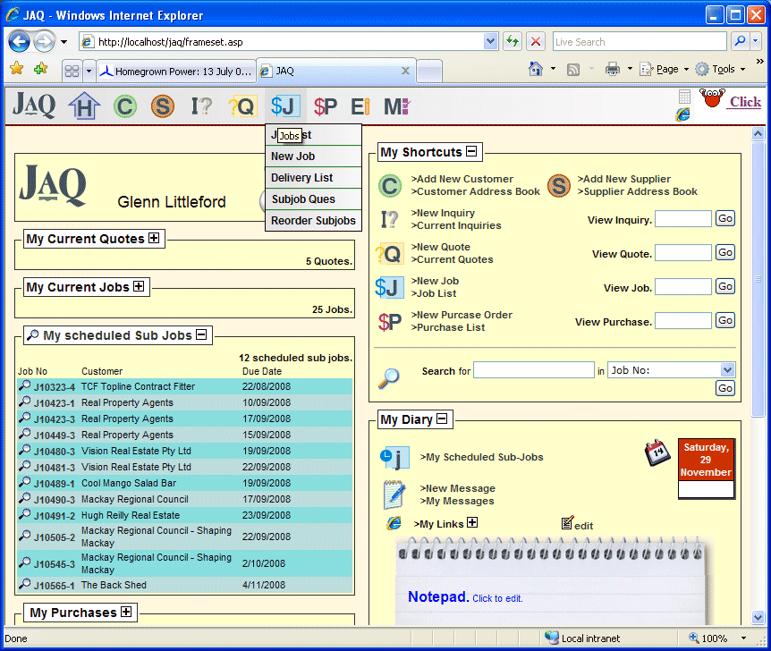 Hi Greg Its all still happening, just taking longer that I thought it would. The software is coming along ok, I have 3 paying customers who have agreed to help with its development in exchange for a lower lease fee. They are providing some great feedback. The feature they like the best is they can open a job card and instantly see a summary of all the purchases, consumables, hours, deliveries, and progress up to date. Makes it very easy to get an up to date job cost. I have trademarked the software name, that takes a few months to process, though its approved unless there is a prior international registration. Some product brochures are on the way, but the help system/manual is still a long way off. I'll send you a private email tomorrow to get in touch. Glenn This is a screen shot of the home page, with mouse over the top menu jobs button to show the drop menu.