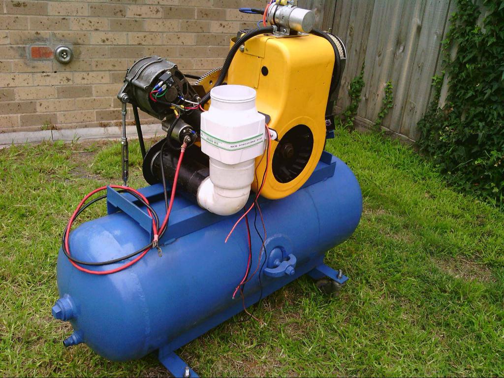 If you really want to make a small engine run quietly, one way to make a very efficient exhaust muffler is to use an old compressed air receiver tank stuffed with fiberglass wool. The steel in these will be at least 10mm thick, and no sound can escape through the walls. There will be a removable inspection plate through which the fiberglass can be installed. These things are heavy, this one weighs just over 90Kg, but it reduces the exhaust noise to just about zero. This looks like an air compressor at first glance, but the big blue tank is actually the exhaust muffler. ![]() Still not finished yet, but I have had it running. ![]() Cheers, Tony. |