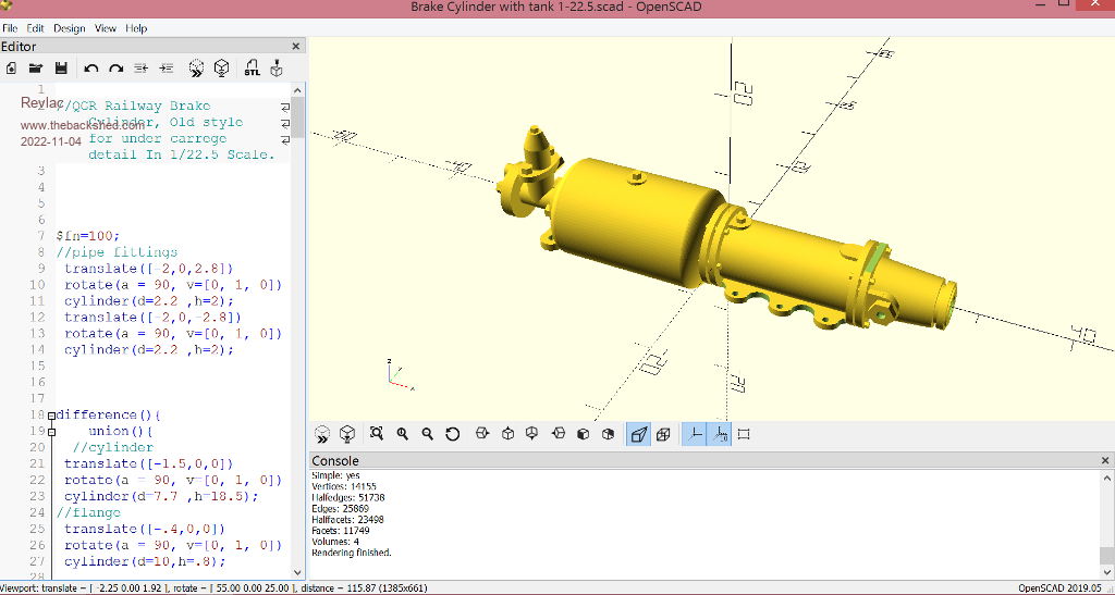 Made a Brake cylinder for under the carriages to ad a little detail. Very handy to have real one on hand as an example. ![]() It was fun to make this using Scad and can be added to if needed. ![]() This is printed with a .2mm nozzle, easy to clean up the support material, I did an initial print with a .4mm nozzle and the detail is not as good but usable, however the support material was a real PITA to remove and clean up the model, worked out faster overall to use the .2mm nozzle this time. The photo is blown up to get a full frame, the model in the picture is only 32mm long. ![]() Scad and STL Brake cylinder.zip Cheers Aaron Off The Grid |