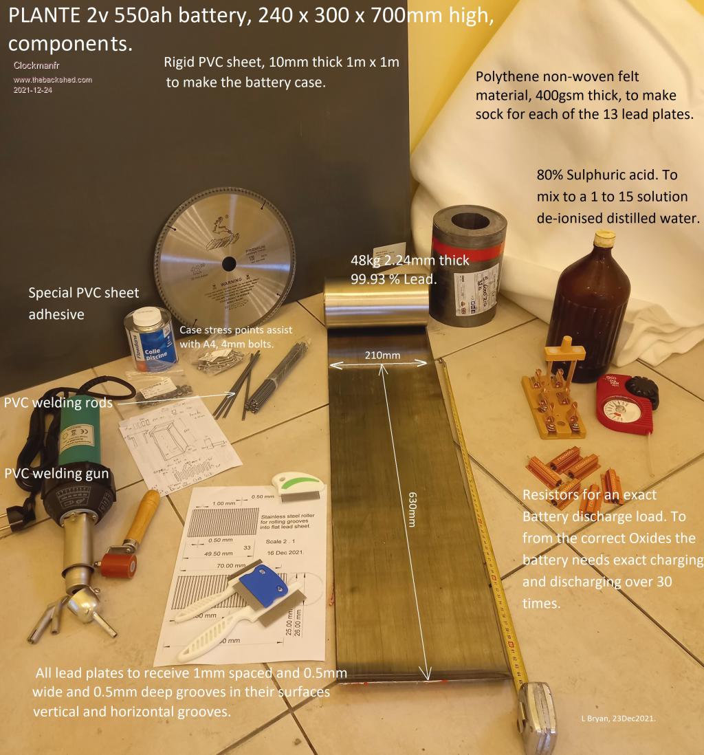 It has the same rolled lead plates for both Anode and Cathode plates, so just lead sheet and no extra added nasty chemicals.  However putting a modern twist into this story, we intend to use a 0.5mm grooves at 0.5mm depth at 1mm spacing vertical and horizontal on each lead plate. This will vastly improve the active surface areas and help hold and form the Oxides we form during the charge and discharge function when commissioning each battery.