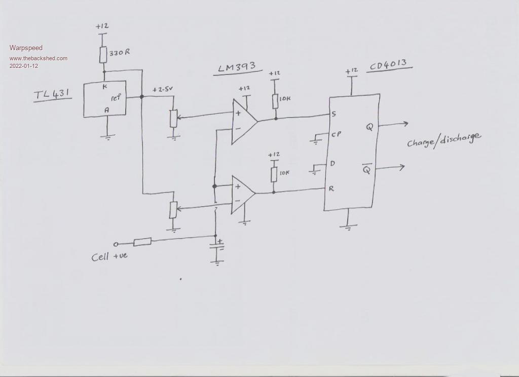 O/k Leslie, first part of the puzzle, a battery cell sex changer that swaps the cell around so we are always dealing with the positive end with respect to ground. ![]() Its just a simple bridge circuit with four N channel mosfets. The mosfets can be as large and as many as necessary (perhaps with heatsinks), or really small for initial testing. As the "cell" will always be at less than 2.5 volts, if we drive the mosfet gates with a much higher voltage such as +12v, we can connect all our gates directly to a flip flop which really simplifies things a lot. The flip flop determines which end of the cell is grounded, and which end becomes positive, for the purposes of both charging and discharging. The next part consists of a stable 2.5 volt regulator using a TL431, and two potentiometers to set the max charging voltage and minimum discharge voltage. A multimeter direct onto the pot would be used to set the required voltages. ![]() A couple of voltage comparators toggle another flip flop to either the "Charge" or "discharge" mode. The discharge load could be a simple resistor or something a bit more complex such as a constant current load. Charging circuit can also be simple or complex. The charge/discharge flip flop just cycles back and forth between the two set voltages. That can toggle the sex change flip flop so it goes through a charge discharge cycle, then changes sex before going through the next charge discharge cycle. Its not a complete circuit, but just a concept. I think something quite simple would be well up to the job. A digital or electromagnetic counter could count the number of sex change cycles easily enough to know when you get to thirty, or whatever. Cheers, Tony. |