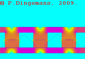 Links to the complete animations can be found below. I like the 2nd one better because of the absence of a sudden transition in the loop, but the price for that is a much larger file. Click on the magnifying glass (near top-right of the image) to start loading the file and viewing the animation. http://picasaweb.google.com/motorconversion/AxialFluxFEMMSim ulations#5288197761856843090 (warning, 7MB filesize) http://picasaweb.google.com/motorconversion/AxialFluxFEMMSim ulations#5288199885557074706 (warning, 15MB filesize) The technical details of the generator are: steel plates 10mm thick AISI-1010. Magnets N40 2"x1"x.5", viewed 'head on' (2" dimension into the screen). Spacing between magnets is 25mm (one magnet width). Minimum airgap 1mm, maximum airgap 27mm. Hopefully others in this forum will find these animations useful too in visualizing and understanding the magnetic fields of axial flux generators. Peter. |
