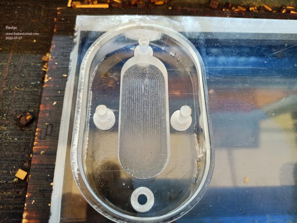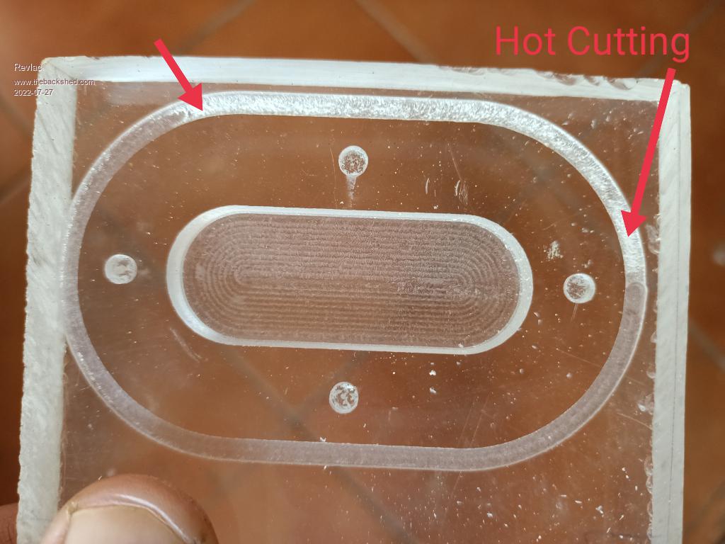 The center cut out went great, but cutting those small holes heated up the mill cutter, should have had air cooling for those, after cutting those 4 holes it then started cutting the perimeter, you can see the cutter was still too hot and produced feathering (white fluffy cut) but after the cutter cooled off a little it was cutting clean again.