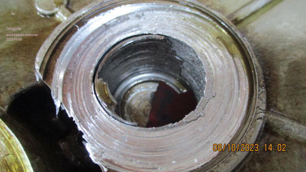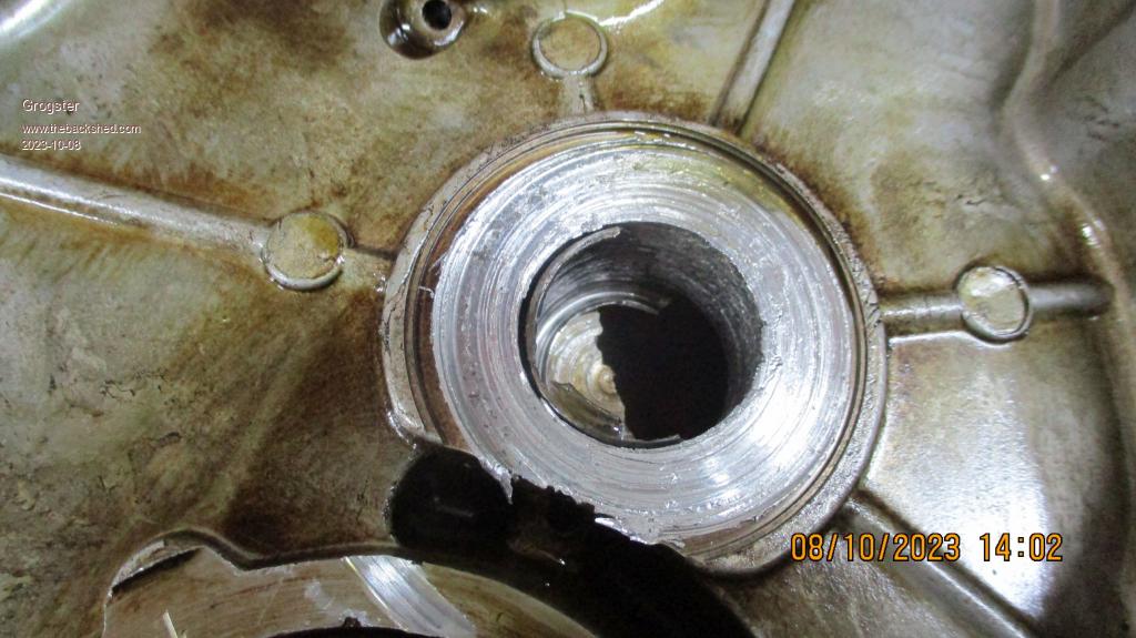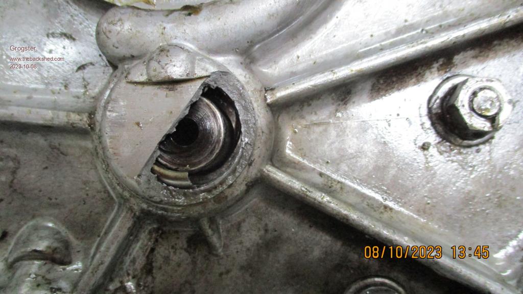 Note that we have not even FOUND the remains of the needle-roller bearing that normally lives in the cover housing, and only a slim amount of the outside of the cage of the bearing shell remains!  Yikes....