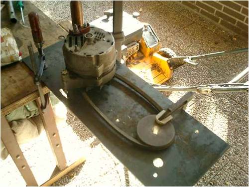 Images below shows test fitting the alternator and engine. There's a curved slot in the 8mm steel mounting plate to be able to tension the belt by varying place of the alternator.