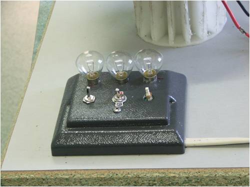 Each of the 3 output phases was connected through a toggle switch to a 12v 35w lamp mounted on the baseboard. This way the load can be progressively increased while turning the handle. It takes quite a bit of effort to fully light the 3 lamps.