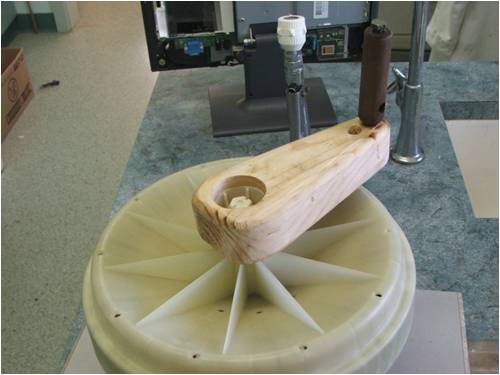 The crank handle was cut from a short length of 90 x 45 pine with a 42mm hole cut in one end using a hole saw. This proved to be a tight fit over the slightly ground down plastic nut on the motor. A long wood screw near the outer end of the arm into the rotor helps to stop it slipping when turned. A long 6mm bolt and piece of drilled broom handle finished the job.