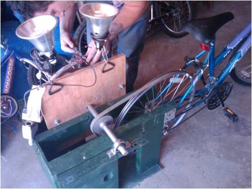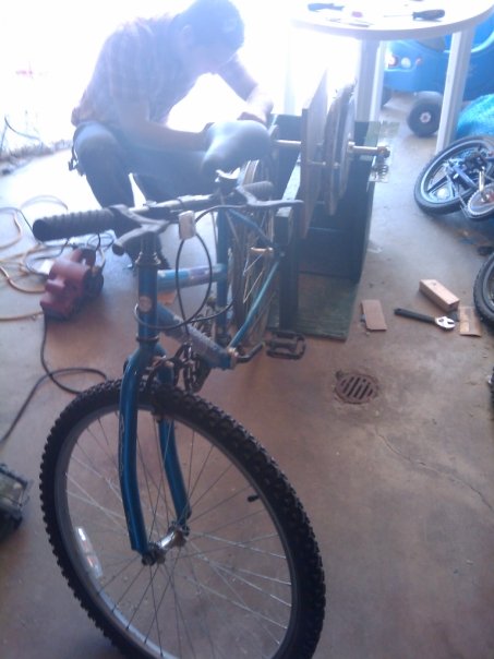 I used a flywheel from a different exercise bike and put it on this one. Then i took a small kids bike flipped it upside down and attached it to the stationary bike where the flywheel attaches.