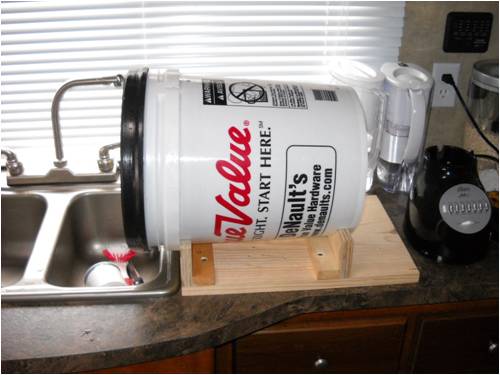 I'm using a plastic 5-gallon bucket with a "Gamma" lid. The lid snaps to the top of the pail and has a rather large screw-on secondary lid, which the manufacturer "guarantees" won't leak. It leaks. That's not a big deal for me, I just worked around the problem and use it so the lid hangs over the inside edge of my kitchen sink, with the bulk of the rest of things sitting on top of the countertop alongside: