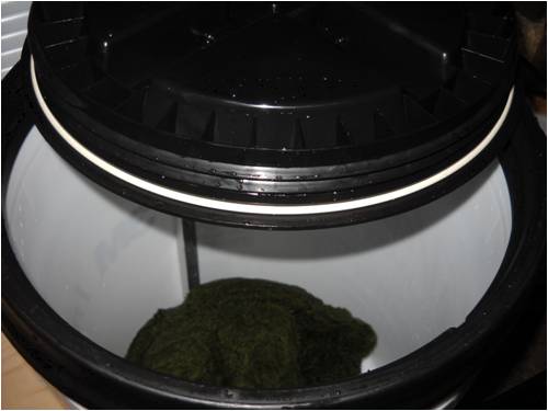 I have a plastic canister with a screw-on lid, sealed with an "O" ring, originally intended to mix a sack of post-hole concrete. Maybe I'll make a contraption that'll spin the thing whilst it sits centered between two rollers and use it as a washing machine instead. I could turn it with a 12-volt motor, which runs off that battery -- recharged by my windmill if I ever get back to finishing it!
