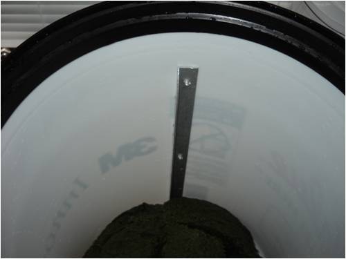 Here's a shot of the inside of the tub showing two small, aluminum paddles (angle stock) which I riveted through the outside of the bucket and sealed with clear silicon caulking. These snag the clothes and then drop them when the whole rig is rotated in the cradle and that action helps move the water through the garments much the same as a commercial front-loading clothes washer does.