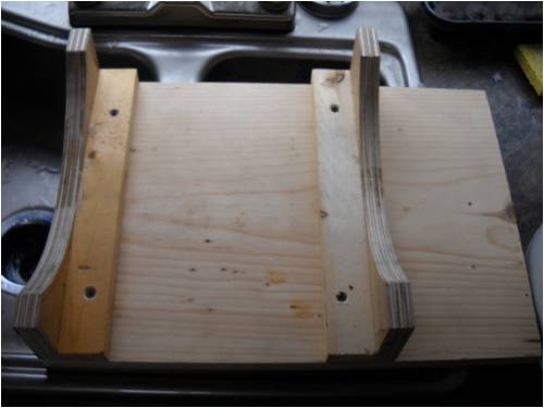 This shows the bare wooden cradle. Note that one side is flush with the edge. I did this to enable the end that leaks to hang over my sink so the drip goes into the kitchen sink drain and not on the floor.