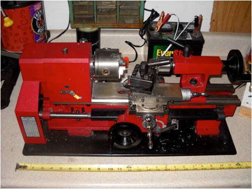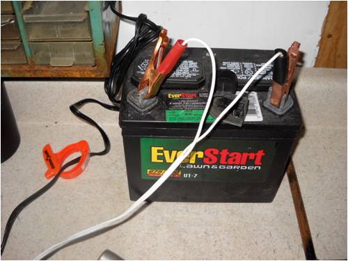 This garden tractor battery is what powers the lathe. It cost me $15 at Walmart. I'm hoping to keep it charged in my trailer "shop" using solar and or wind power.