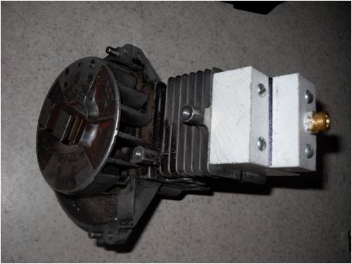 Okay, enough of that. Now for a few looks at air engines. This first one is made from a 2-cycle weed-eater engine. I made what is termed a "bash" valve, which doesn't show. All it consists of is a little poppet valve inside. When the piston gets to 7 degrees BTDC (before top dead center), the piston top slams into the valve stem and lifts it off its seat, allowing compressed air to enter the cylinder. This is what is called a "uniflow" engine. The steam (air here) path is one direction, in at the top and out through the regular exhaust ports machined into the skirt of the cylinder.