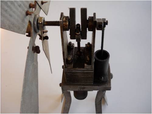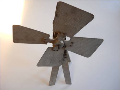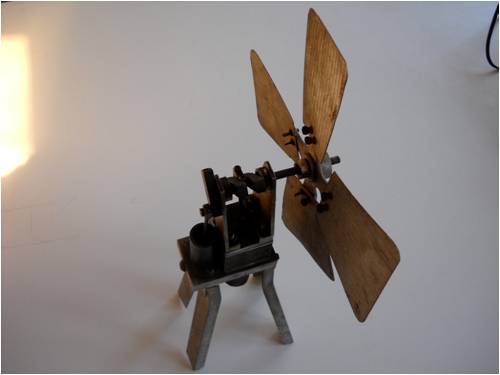 This is a Sterling-cycle heat engine with a fan blade attached. Heat is applied to the little canister at the bottom. When the thing glows red hot, you merely give the fan a crank in the correct direction and away it goes. it's WAY inefficient, but it's fun to watch.